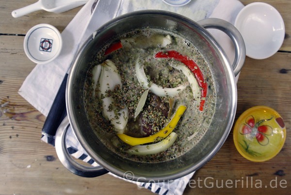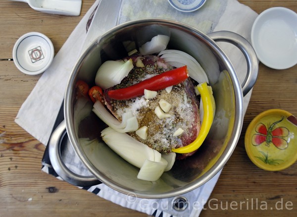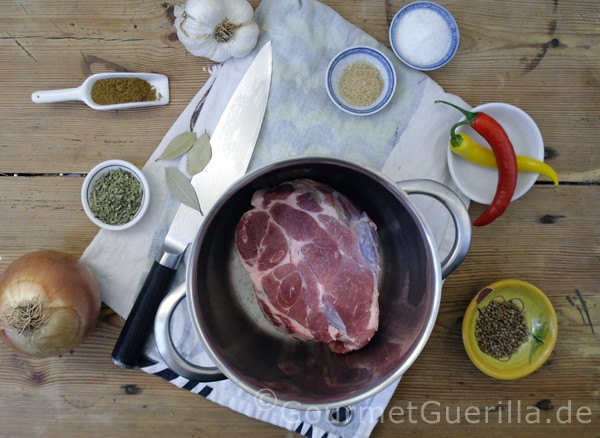 Man nehme 1 kg Schweineschulter ohne Knochen (ich habe leider nur Nacken bekommen, der aber auch funktioniert hat) sowie 1 große Gemüsezwiebel gepellt und in Spalten, 1,5 EL Oregano, 3 Lorbeerblätter, 1 EL gemahlenen Kreuzkümmel, 3 große Knoblauchzehen gepellt und grob zerteilt, 1 EL braunen Zucker, 1 EL Salz, 2 Chilischoten halbiert und 1 EL Korianderkörner.