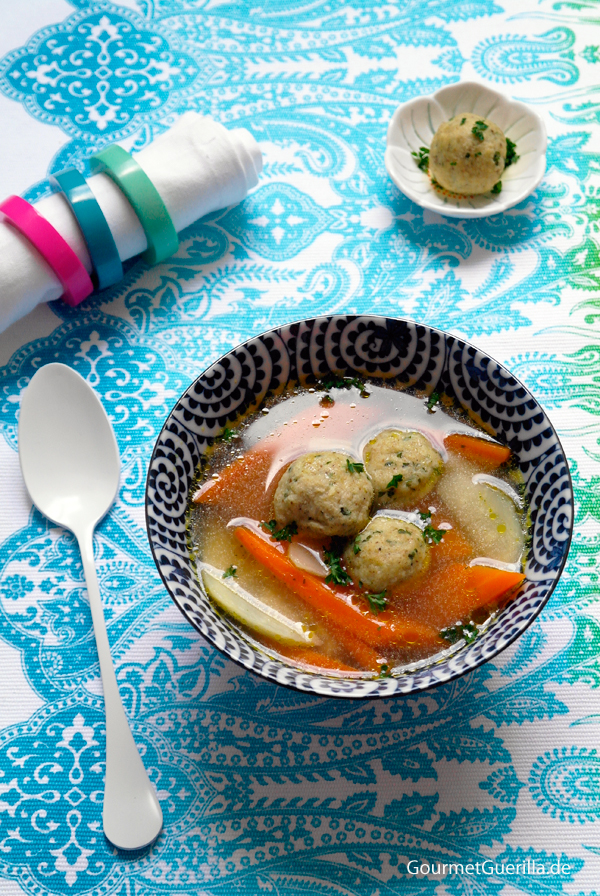Was soll ich sagen: Treffer, versenkt. Ich wollte immer schon Matzo Ball Soup – oder auf Deutsch – Mazze-Knödelsuppe machen. Auf amerikanischen Blogs habe ich so oft über das typisch jüdische Gericht zu Passover (dem Pessachfest) gelesen. Die Klößchen werden aus Mazzemehl oder gemahlenen Matzót-Broten hergestellt. Die riesigen crackerartigen Matzót-Brote bestehen lediglich aus Mehl und Wasser. Fast geschmacksneutral und nur durch Rösten mit ein wenig Aroma ausgestattet, sollen sie an den jüdischen Auszug aus Ägypten und die Befreiung aus der Sklaverei erinnern. Während der Flucht durch die Wüste konnten die Menschen nämlich laut Legende nur ungesäuertes Brot backen. Der Verzehr der koscheren Matzót und Matzo Ball Soup gehört daher jedes Jahr zu einem der wichtigsten jüdischen Feste unbedingt dazu. Überhaupt scheint die Suppe mindestens in New York besonders hipp, allgegenwärtig und gegen Grippe mindestens so gut wie Penicillin zu sein.