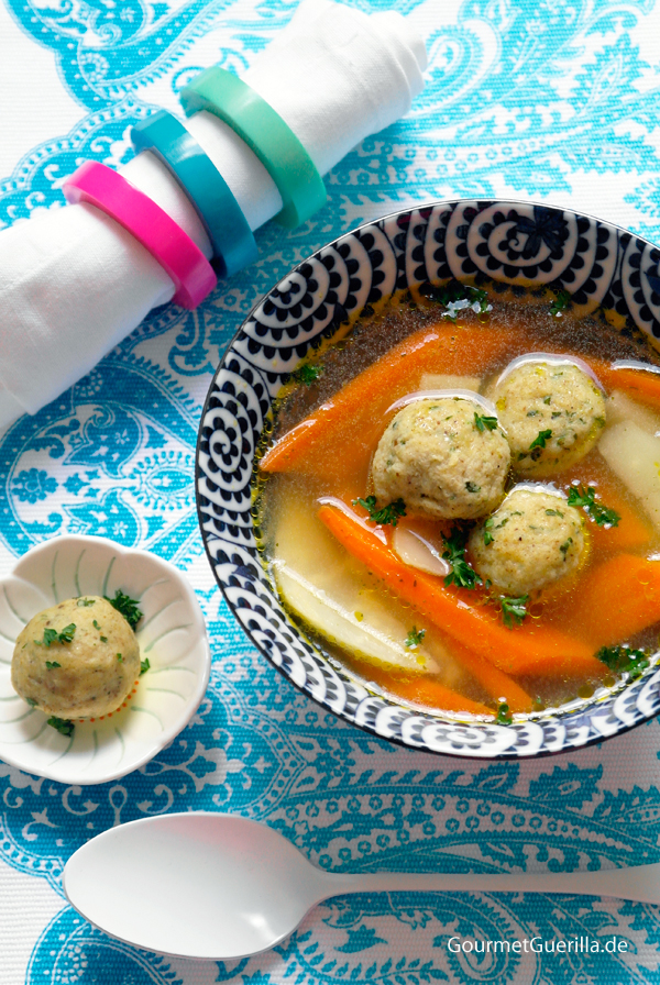 Das Ergebnis: Ein sehr sanfte, harmonische und leckere Suppe, in der alle Bestandteile für sich wunderbar zur Geltung kommen. Die Klößchen gehen ähnlich wie Grießklößchen auf, erinnern aber in ihrer Konsistenz eher an Markklößchen. Geschmacklich sind die Matzo-Klößchen herzhaft und nehmen das Aroma der Brühe sehr gut an. Eine perfekte herzhafte Variante für Vegetarier: Markklößchen ohne Fleisch (dann auch lieber in Gemüsebrühe gegart).