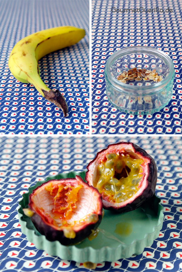 Die Bananenhälften auf einem Teller anrichten, 4 EL kalten Vanille Soja-Joghurt (oder herkömmliches Joghurt) über die Bananen löffeln und die gerösteten Getreideflocken darüberstreuen. Mit der geschmolzenen Schokolade beträufeln und mit dem Fruchtfleisch 1 Maracuja toppen.