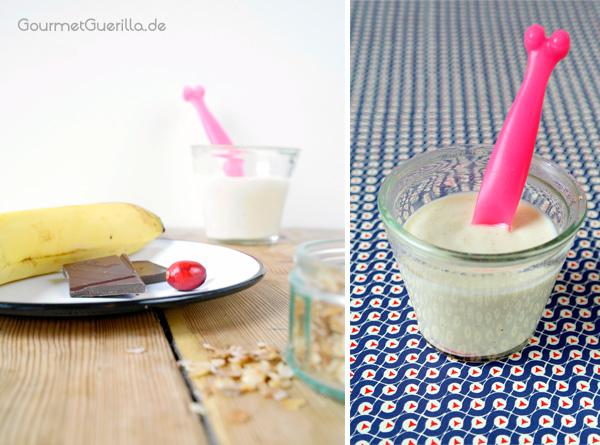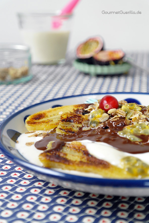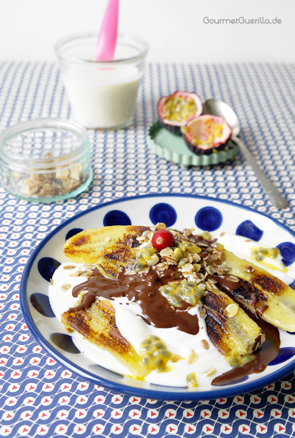 Und eigentlich würde das auch prima gehen: Denn im Gegensatz zu seinem eisigen Verwandten, enthält unser Frühstücks-Banenen-Split ungefähr so viel Zucker und Fett wie ein durchschnittliches Müsli und zählt damit eindeutig in die Rubik „gesundes Frühstück”. Dabei ist es ganz einfach und schnell: Gebratene Bananen werden mit Vanille-Soja-Joghurt, grösteten Getreideflocken und einem Löffelchen geschmolzener, dunkler Schokolade auf einem Teller arrangiert. Als frisches Topping machen sich leicht säuerliche Früchte wie zum Beispiel Maracuja richtig gut. Eines kann ich Euch wirklich versprechen: Ihr werdet es lieben!