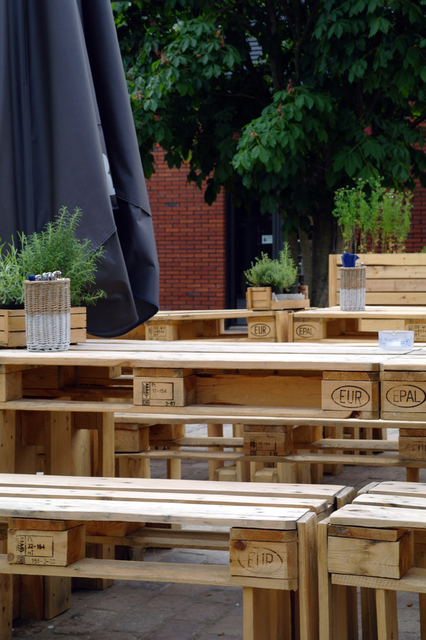 Ich gebe natürlich gern zu, dass dieser Zeitpunkt vor allem für Familien attraktiv ist. Dementsprechend überwältigend war dann auch das Platzangebot in der alten, sehr charmant umgebauten Fabrikhalle mit Kamin, offenem Backbereich und großen Fensterfronten. Wir waren die einzigen und ersten – in der Großstadt, in der sonst immer und überall eigentlich zu viele Menschen sind, eine ungewohnte Idylle. Im großen Innenhof lassen wir uns an Tischen und Bänken aus Paletten nieder. Da außer uns niemand da ist, können die Kinder im Innenhof rennen, ein bißchen an den Paletten rumklettern und stören dabei absolut niemanden. Maximale unverhoffte Entspannung für die Erziehungsberechtigten …