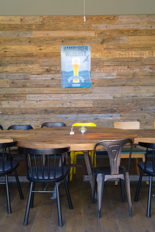 Jetzt war aber schon wirklich fast jeder im Alten Mädchen. Nur ich nicht. Dabei liegt das für seine über 60 ausgewählten Craft-Biersorten bekannte (Achtung!) Braugasthaus genau vis-a-vis unserer Dreh-und-Angelpunkt-S-Bahn-Station „Sternschanze”. Ich fahre also exakt jeden Morgen und Abend einmal daran vorbei und denke „Och, da müssten wir jetzt aber auch echt mal rein.” Ehrlich gesagt verzehre ich mich persönlich ja nicht unbedingt nach Bier. Und auch beim Wort „Braugasthaus” flippe ich nicht gleicht komplett aus. Da mir aber jeder, der bis jetzt da war (sogar Kleinfamilien mit Kleinstkindern), eidesstattlich versichert hat, dass es dort ganz, ganz toll ist, haben wir es endlich getan. Und zwar zum Frühschoppen am Sonntagmorgen punkt 10 Uhr. Der Himmel strahlt in reizendem Hamburger Grau – das Alte Mädchen steht trotzdem aufrecht.