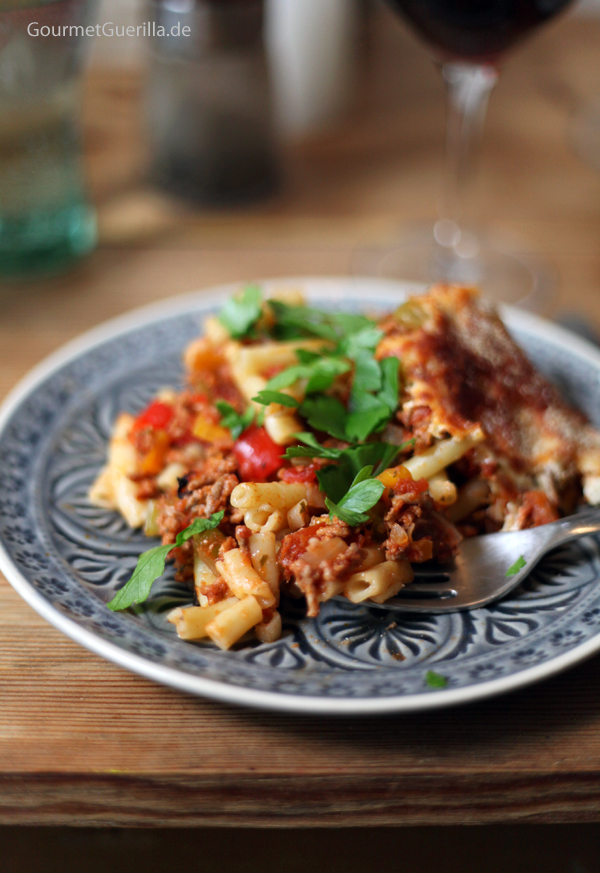 Mit dem Gemüsekorb, vom Mann gejagten Makkaroni und dem Kind finde ich mich dann am Samstag wieder in der Küche ein. Wir basteln pädagogisch wertvolle Makkaroni-Lasagne als Mittagessen. Ein große Form, die auch noch direkt für den Sonntag reicht. Mit viel Gemüse und echten Gewürzen in der Soße und Nudeln, die auch wirklich an allen Stellen gar sind.
