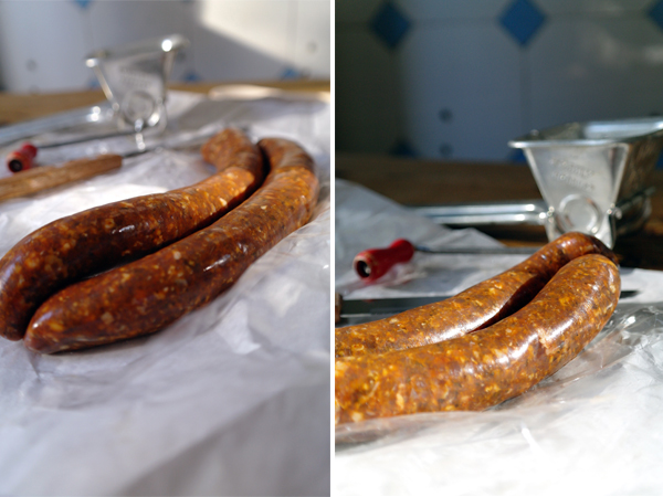 In alle den Jahren danach habe keine vergleichbare Wurst mehr gegessen. Bis ich letzte Woche durch Zufall diese handgemachten Merguez aufgestöbert habe. Die sahen einfach so gut aus. Der Händler lässt sie aus 100% Lamm mit orientalischen Gewürzen und ohne weitere Zusatzstoffe von einem Fleischer in Hamburg herstellen.
