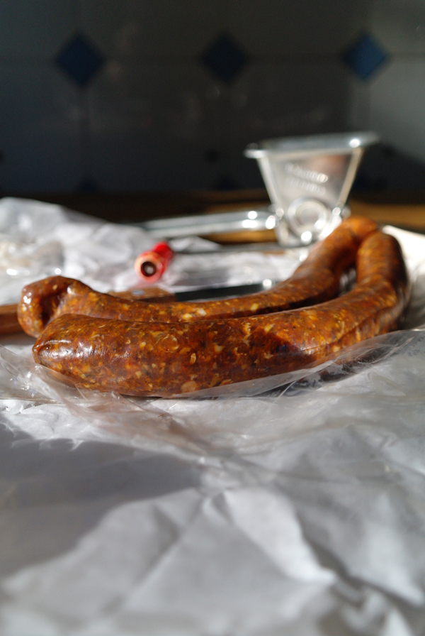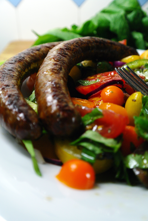 Die fertig gebrutzelten Würste haben nicht nur viele Erinnerungen und große Freude ausgelöst, sondern auch einen wirklich angemessenen Partner für den Tomatensalat abgegeben. Man konnte sogar Unterschiede bei den Tomaten rausschmecken: manche waren eher nussig, andere süßlich und dann gab es noch welche mit ganz zartem Aroma. Dazu die leicht scharfe Lamm-Wurst. Perfekt!