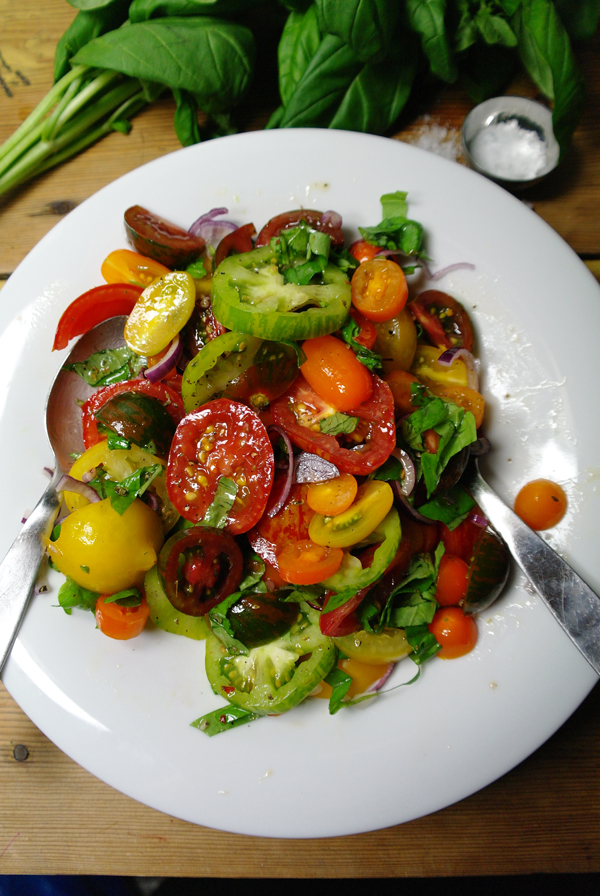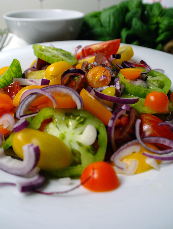 Die Tomaten habe ich in unregelmäßige Scheiben und Stücke geschnitten, damit die verschiedenen Sorten auch richtig zur Geltung kommen. Dazu kam eine in dünne Scheibchen geschnittene rote Zwiebel.