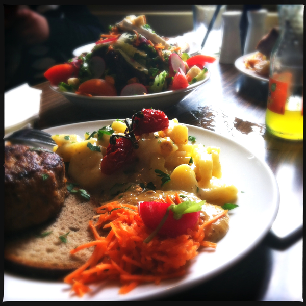 An diesem Tag ist nichts zu machen. Es gibt keinen Tisch, alles ist voll oder reserviert und wir haben – nein leider – keine Lust, das Essen auf der Bordsteinkante sitzend einzunehmen. Der Mann ist muksch und ärgert sich still aber deutlich vor sich hin. Unsere Mägen knurren immer lauter und so beschliessen wir, in den nächstbesten Burgerladen einzufallen und den nahen Hungertot effektiv abzuwenden. Sonntag, eigentlich hatte ich etwas anderes von dir erwartet.