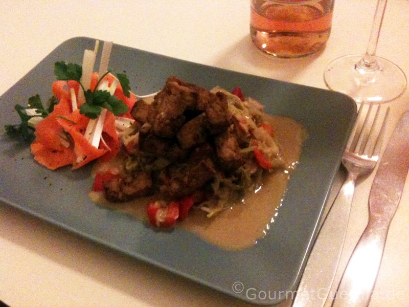 Während der Tofu fritiert, je einen einen Schuss Soja oder Hafer Cuisine und Wasser sowie einen EL Tahine (Sesampaste) zum Spitzkohl/Paprika geben. Gut umrühren und mit einen Spritzer Zitronensaft und evtl. noch Salz und Pfeffer abschmecken.
