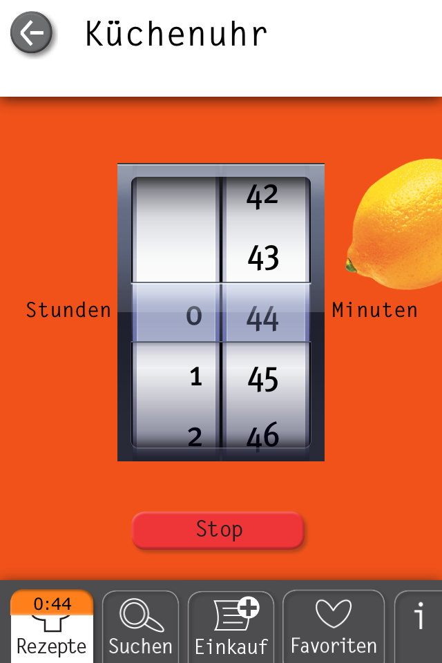 Ein nettes Gadget: Die Küchenuhr. Einfach die Koch- oder Backzeit einstellen und erinnern lassen. Die Küchenuhr funktioniert übrigens auch im Hintergrund, wenn man die App schliesst und das Telefon zwischenzeitlich tatsächlich für andere Dinge als Rezepte benutzt.